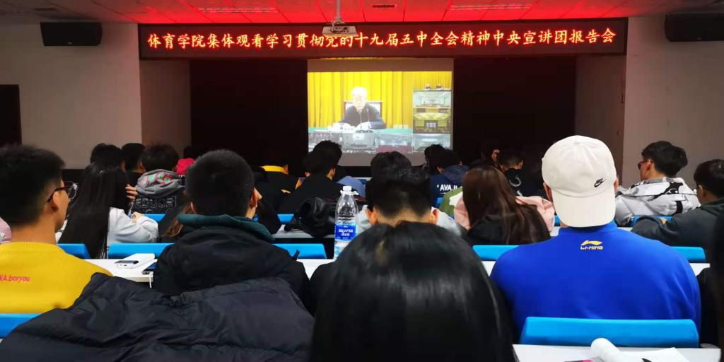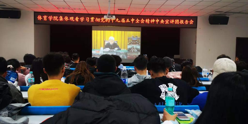 按照《中国共产党章程》和《中国共产党发展党员工作细则》要求,为帮助研究生入党积极分子进一步掌握党的理论知识,保证研究生党员后备队伍质量,于2020年11月12日晚上8点在体育学院五层会议室体育学院全体研究生积极分子观看学习“贯彻党的十九届五中全会精神”中央宣讲团报告会。