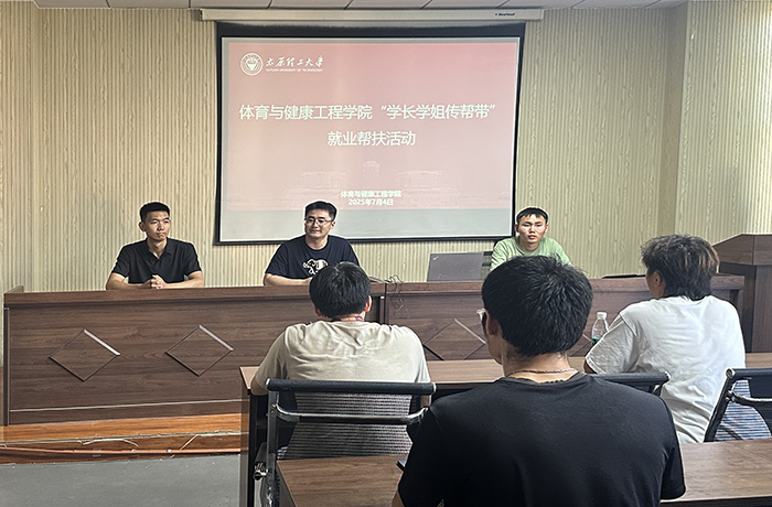 2025年7月4日,太原理工大学体育与健康工程学院在学院510会议室举办“学长学姐传帮带”就业帮扶活动。活动邀请体育教育2024届优秀毕业生范轩瑞(现就职于吉林省松原市公安局)、牛鹏辉(现就职于山西省晋城市体育局)返校,与学弟学妹们面对面交流就业路上的宝贵经历,分享求职经验,为在校生提供切实指导,体育教育专业50余名本科生报名参加活动。体育与健康工程学院团委副书记兼学工办副主任姜昆、负责就业专项工作辅导员滕冕参加活动,活动由姜昆主持。