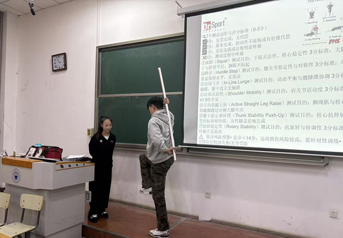 理论讲解结束后,靳文卓治疗师带领学生进入实践互动环节,将劳动技能培训落到实处。他先是规范演示了功能性动作筛查(FMS)中的7个核心测试动作,动作标准、讲解通俗,让学生快速理解动作要领;随后聚焦实用急救技能,现场教学崴脚后的应急绷带包扎方法及运动前关键部位(脚踝、手腕等)的防护包扎技巧,并细致演示肌内效贴的裁剪与粘贴方法。学生积极参与实操练习,主动配合演示的同学还获得了定制小礼品,现场互动氛围热烈,将活动推向高潮。