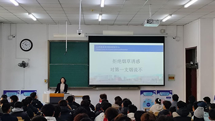 为贯彻落实《健康中国行动(2019—2030年)》控烟行动目标任务,精准掌握高校大学生烟草流行现状及影响因素,降低青年群体烟草依赖风险,同时以高校为辐射平台向家庭、社会传递控烟共识,2025年10月31日,体育与健康工程学院携手山西省疾控中心在明向校区行知楼B113教室举行“宣传烟草危害,远离烟草制品”烟草危害健康大讲坛。山西省疾控中心马麟科长、王鑫老师、太原市疾控中心史坚科长,太原市万柏林区疾控中心副主任胡瑞琴受邀走进校园,体育与健康工程学院团委副书记兼学工办副主任姜昆以及150名青年学生参与活动。