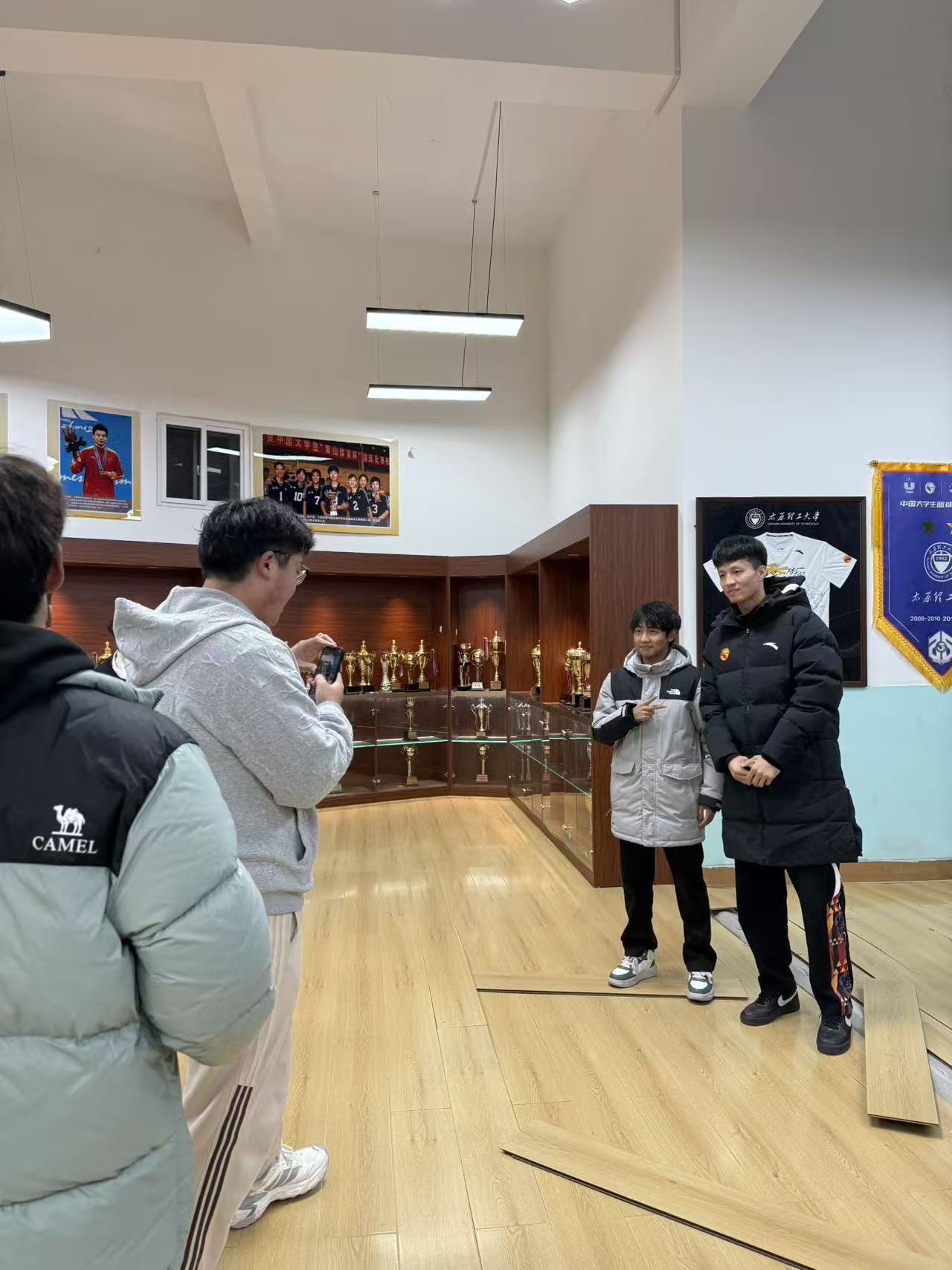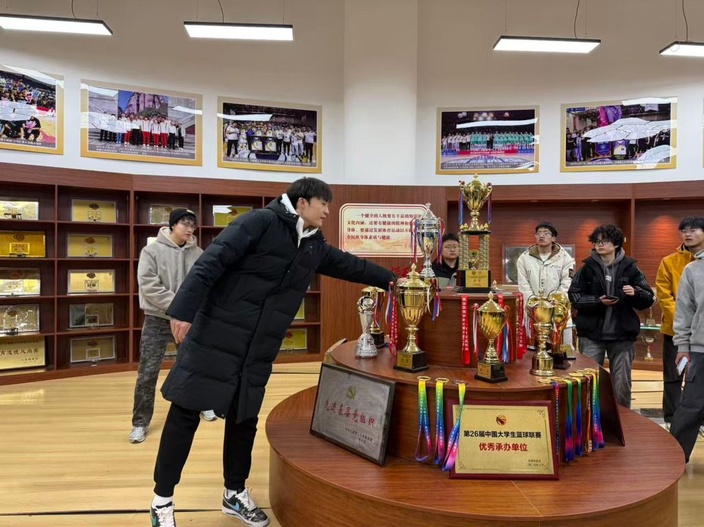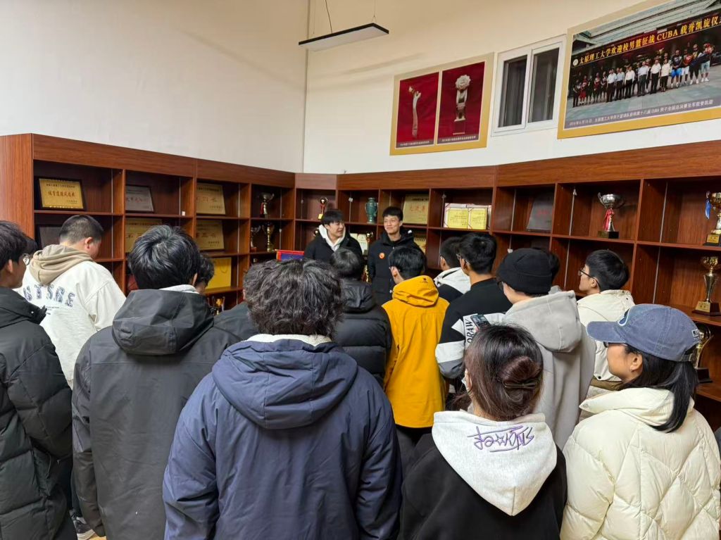活动现场,学校男篮运动员段成果、杨虎龙以实践讲解员身份,带领同学们参观荣誉室。他们围绕学校篮球项目发展脉络,系统介绍了基地建设背景、发展历程、制度体系及各级联赛突出成绩,重点展示了球队历年斩获的奖杯、奖牌、锦旗、荣誉证书等实物资料,以及优秀代表人物事迹。图文展板、实物陈列与视频资料的综合呈现,生动勾勒出太原理工大学男篮顽强拼搏、团结协作、敢打硬仗、永不放弃的精神图谱。