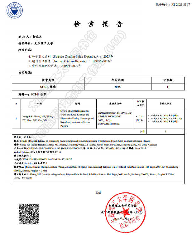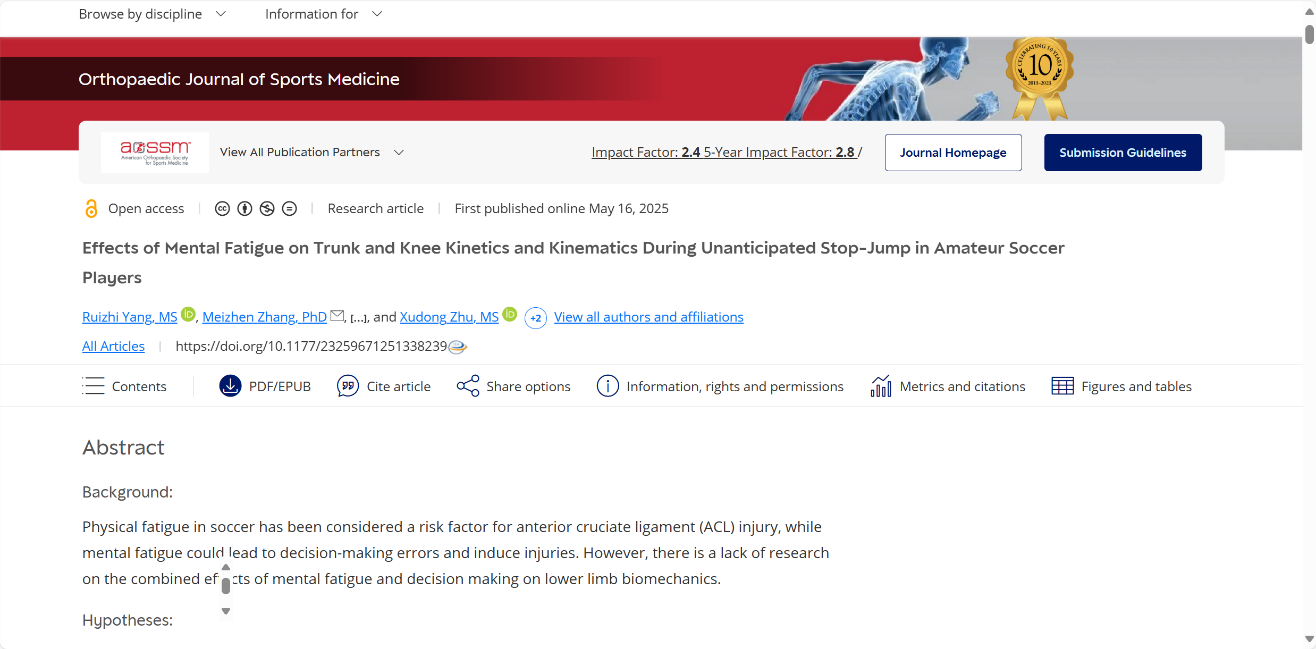 我院教师张美珍教授团队的研究成果《Effects of Mental Fatigue on Trunk and Knee Kinetics and Kinematics During Unanticipated Stop-Jump in Amateur Soccer Players》在《Orthopaedic Journal of Sports Medicine》在线发表。《Orthopaedic Journal of Sports Medicine》是由美国运动医学会(AOSSM)开发的一本全球性、同行评审的在线期刊。聚焦骨科运动医学、关节镜手术、膝关节和肩关节置换术以及运动相关损伤的统计与预防等研究方向。该期刊被SCIE(Science Citation Index Expanded)收录,被评定为“JCR-Q2,中科院3区,影响因子2.4(2023年)”期刊。该论文是我院硕士研究生杨蕊芝(第一作者)在导师张美珍教授(通讯作者)指导下完成的研究成果,太原理工大学体育与健康工程学院为第一署名单位。