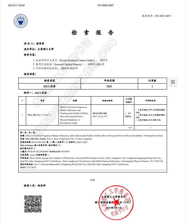 我院教师温泽滨讲师作为第一作者的研究论文《(Effects of Exercise Program on Mental, Pulmonary, and Cardiovascular Health of Elderly Men with Acquired Severe Physical Disabilities: A Retrospective Study)》在国际期刊《Healthcare》(2025年卷13期)正式发表。该期刊为社会科学引文索引(SSCI)来源期刊,2023年影响因子2.4,位列中科院期刊分区医学大类4区。