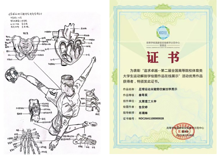 本次获奖彰显了太原理工大学体育与健康工程学院“以赛促学、知行合一”的教学成果。在我院领导团队的顶层设计与大力支持下,学院始终强调体育专业教学中理论与实践深度融合:不仅传授扎实的运动解剖学知识,更着力推动知识向运动实践转化;积极搭建多元实践平台与竞赛通道,全面提升学生专业应用能力。同时,我院鼓励创新思维,引导学生在解剖绘图等实践中融入独特见解。这一系统性培养模式,在院领导持续优化的育人生态中,为学生专业精进提供了坚实支撑与广阔空间。