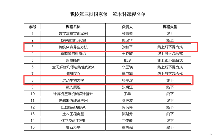 8月21日,教育部高等教育司公布《关于第三批国家级一流本科课程认定结果的公示》,我院张美珍教授团队的《运动生物力学》(线下一流课程)和张和平教授团队的《传统体育养生方法》(线上线下混合式一流课程)成功获批,实现了我院国家级一流本科课程零的突破,标志着我院在本科课程建设方面取得新的突破。