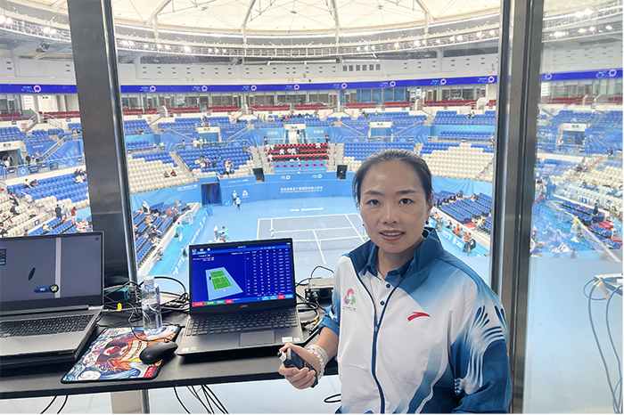 网球国际级裁判,担任全运会网球项目决赛阶段技术官员。她曾执裁温布尔顿网球公开赛预选赛、澳大利亚网球系列赛、亚运会、世界大学生运动会等多项国际赛事,具备丰富的执裁经验与专业能力。此次全运会,她担任鹰眼裁判,以对最新规则的深刻理解、对鹰眼系统操作的精准高效,确保了技术裁决的零差错,有力保障了赛事的高水平运行与公平公正,生动诠释了我校教师在国际标准下的专业形象。
