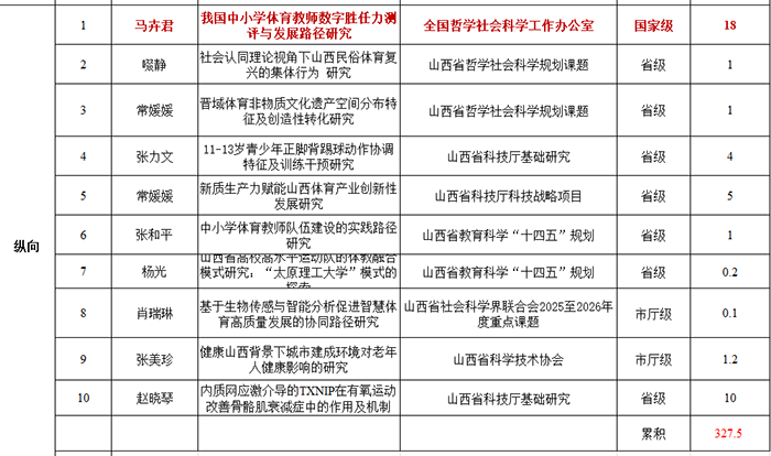 在全体教师的共同努力与不懈追求下,体育与健康工程学院2025年度科研工作成果丰硕,捷报频传。截至近期,学院年度科研到账经费总额累计突破 327.5万元,创下历史新高,标志着学院科研整体实力与服务水平迈上了一个崭新的台阶,为学科建设与创新发展注入了强劲动力。
