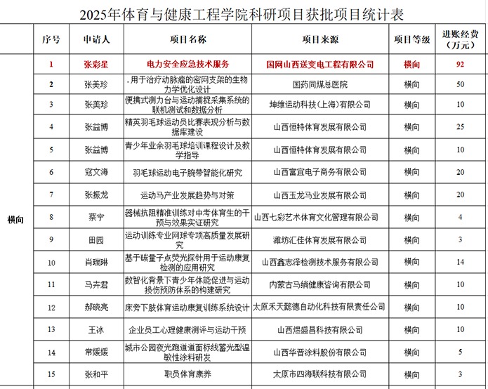 · 张彩星老师承担的横向课题《电力安全应急技术服务》(合作单位:国网山西送变电工程有限公司),到账经费高达92万元,充分体现了学院面向行业重大需求、解决实际问题的强大应用研究能力与技术服务水平,是产学研深度融合的典范。