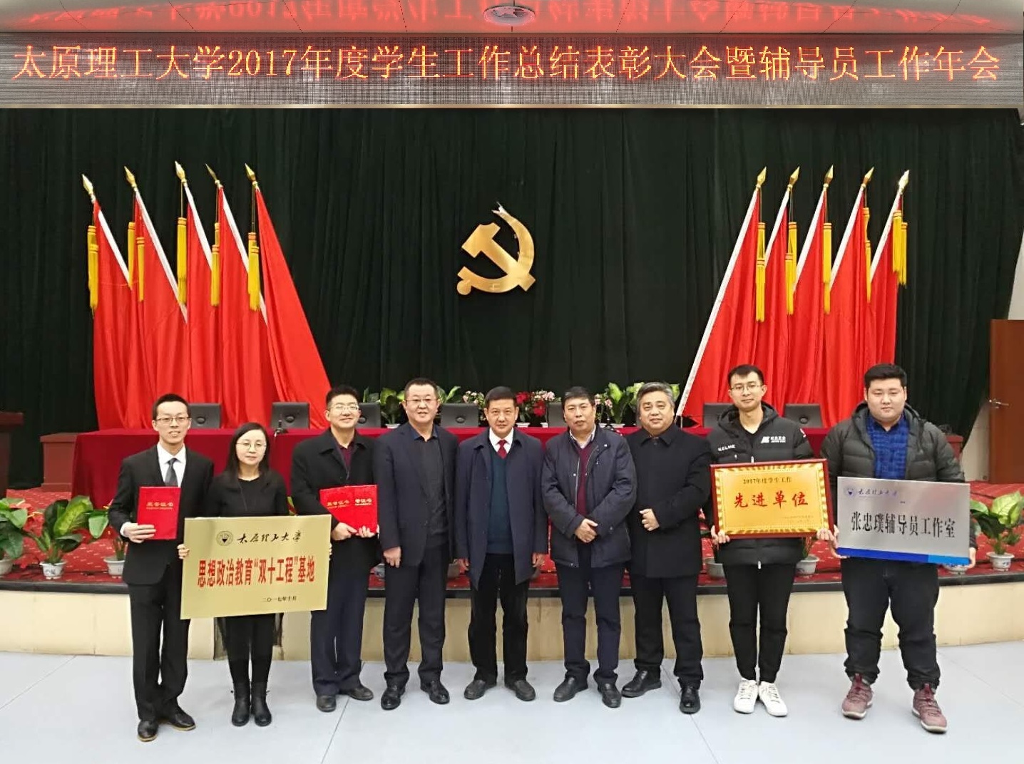2018年1月21日,太原理工大学2017年度学生工作总结表彰大会暨辅导员工作年会在迎西校区举行。体育学院的《第二操场-大学生阳光体育发展中心》做为学校首批十个思想政治教育“双十工程”建设项目之一与学校首批四个校级辅导员工作室之一的《张忠璞辅导员工作室》同时被授牌;体育学院荣获2017年度学生工作先进单位(全校十个)表彰;辅导员李文彬和高晨晖分获学校首届辅导员职业能力大赛的第二名和第四名,占据了二等奖的三分之二;李文彬获得“辅导员工作先进个人”荣誉称号;辅导员优秀案例评选中,李文彬也榜上有名荣获三等奖……体育学院可谓全面开花,硕果累累,成为了本次总结表彰大会的最大赢家之一。