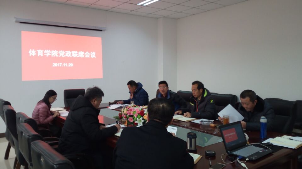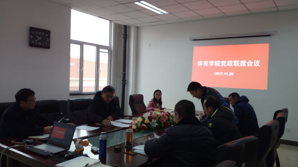 2017年11月29日添加到日历上午,体育学院召开了2017年第14次党政联席会议。会议由党委书记任晋军主持,学院党政领导及教科办主任、学院工会主席参加了会议。
