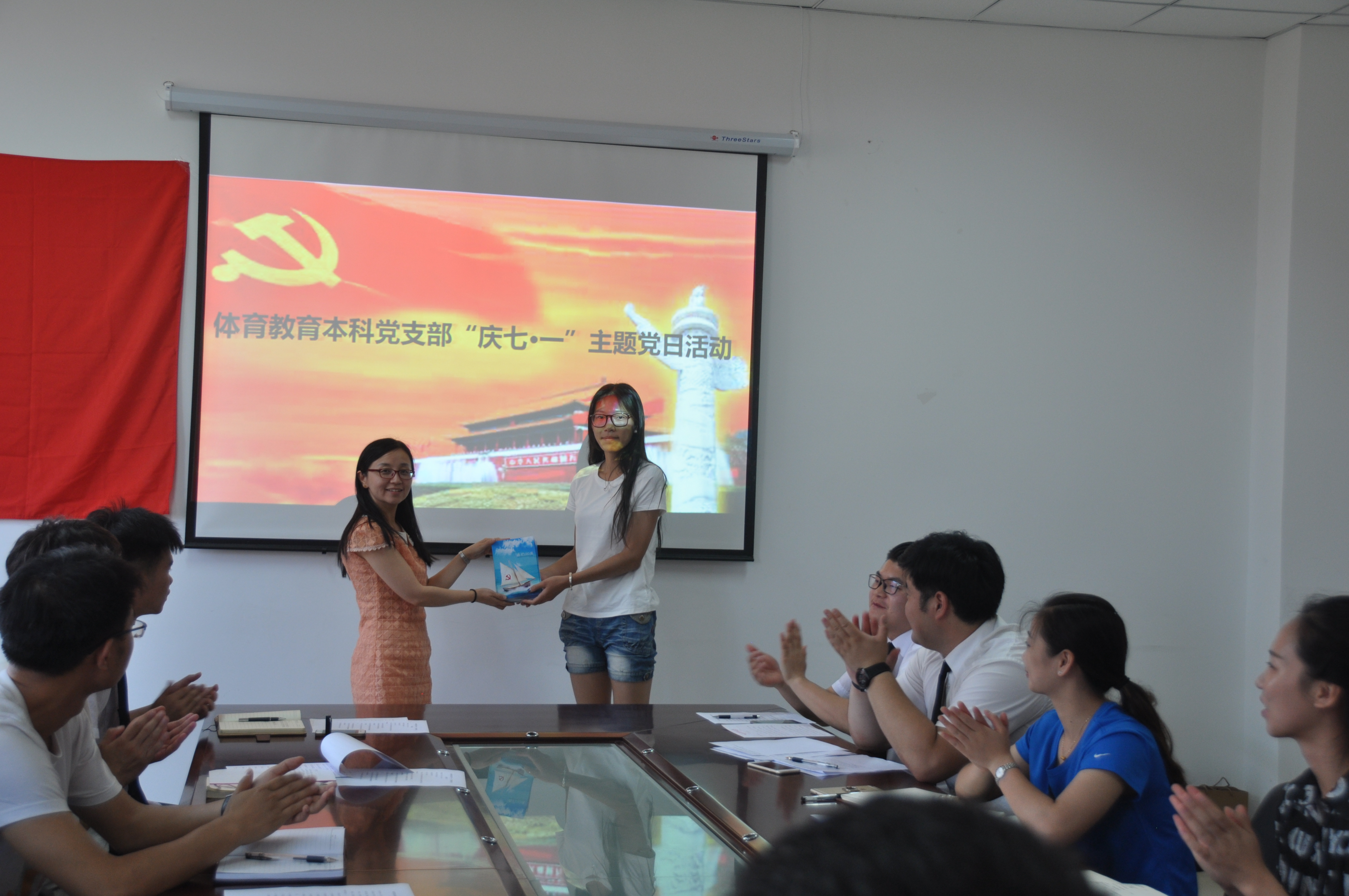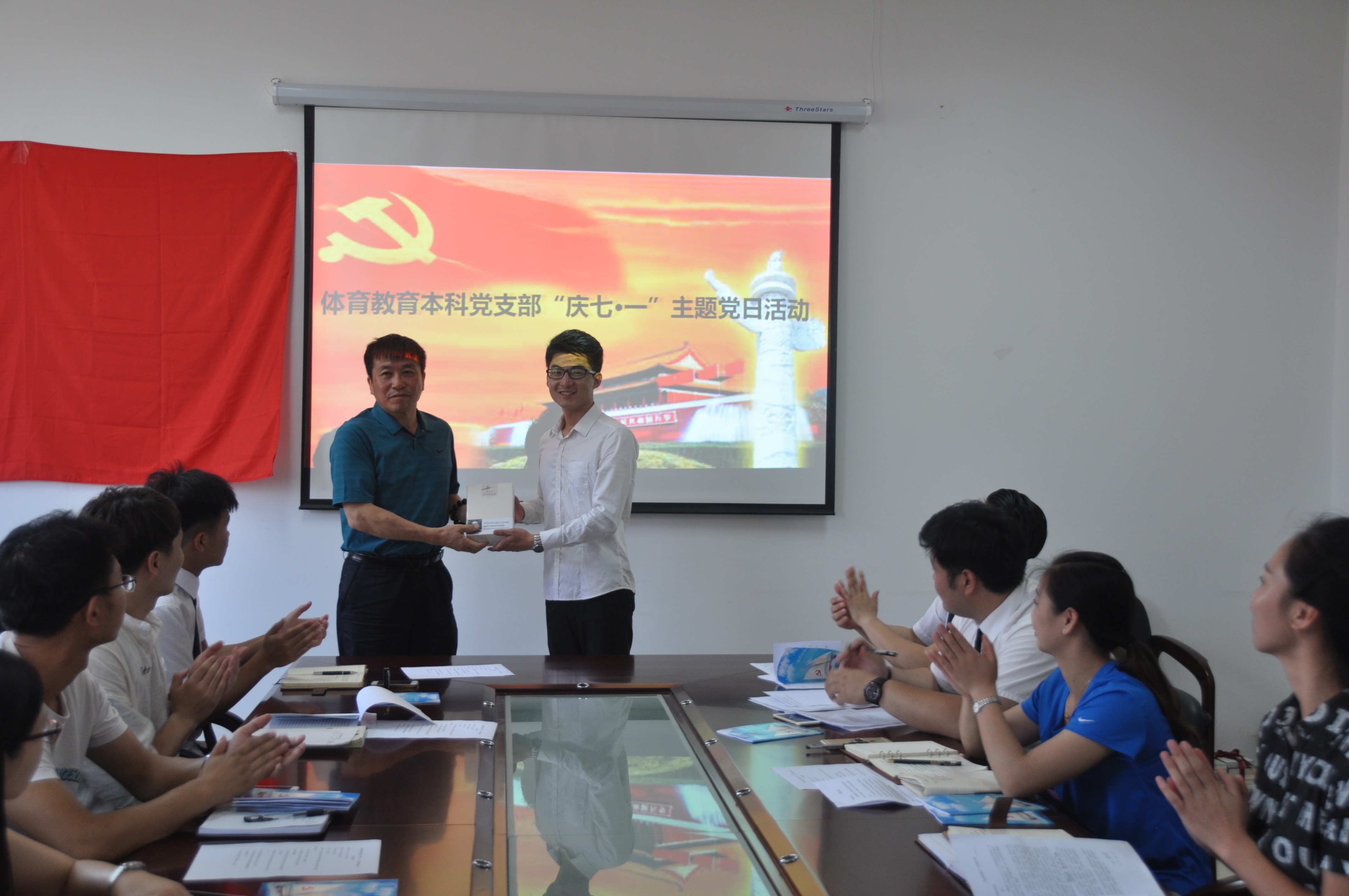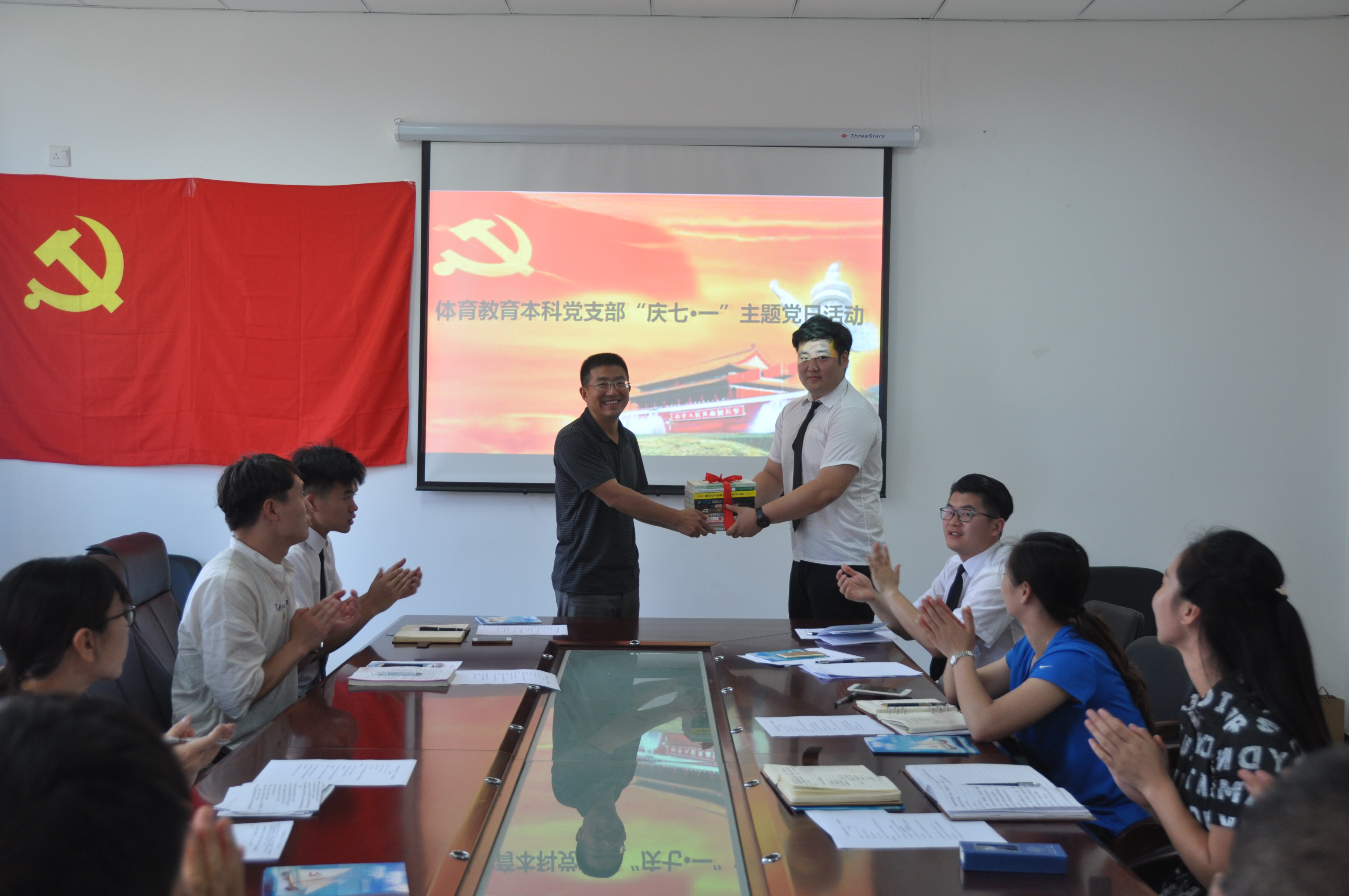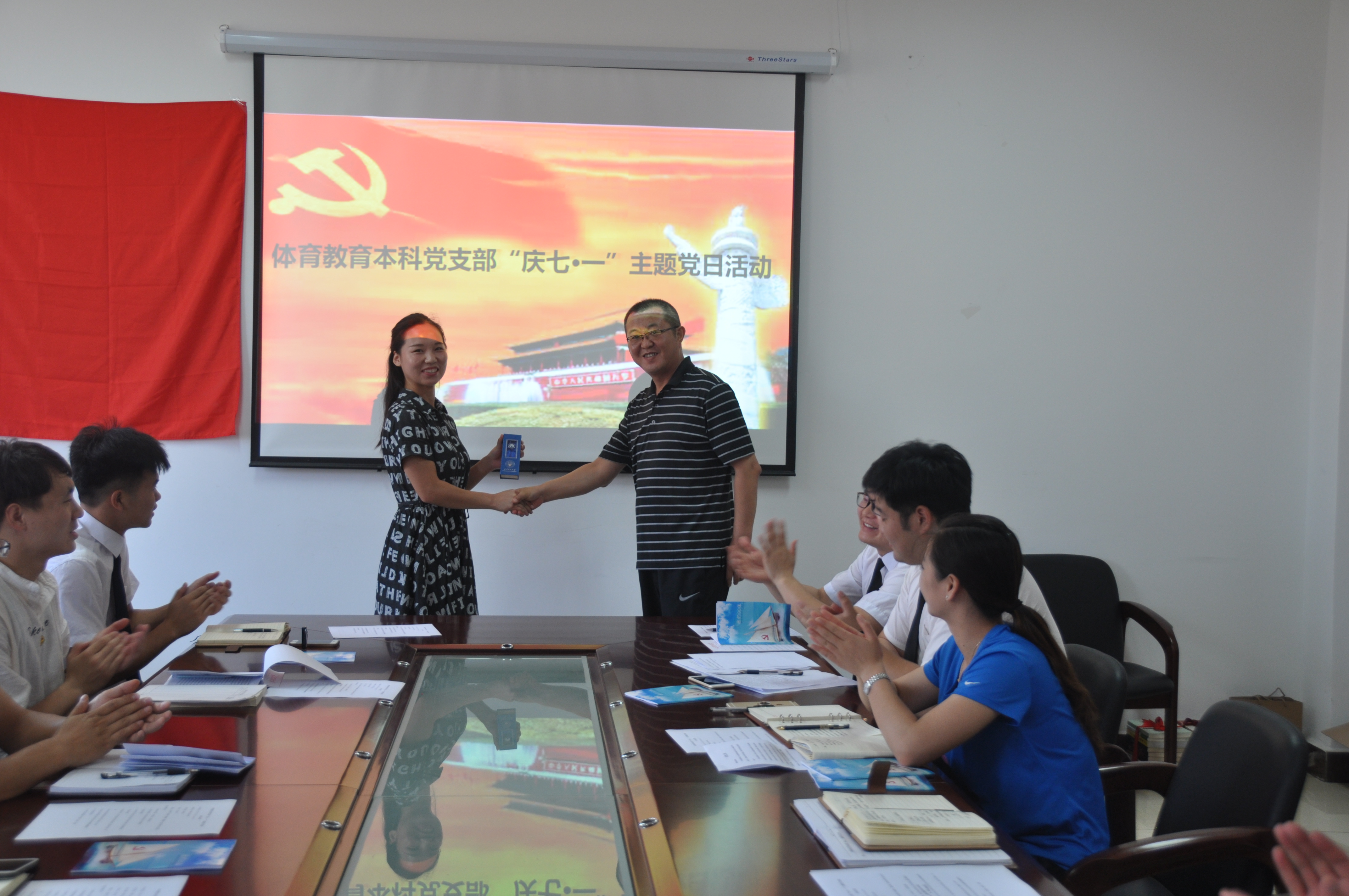 体育教育本科党支部开展“庆七·一”主题党日活动,院党委书记任晋军、党委副书记张忠璞、团委书记、部分学生党员、积极分子参加会议。会议由支部书记李文彬主持,
