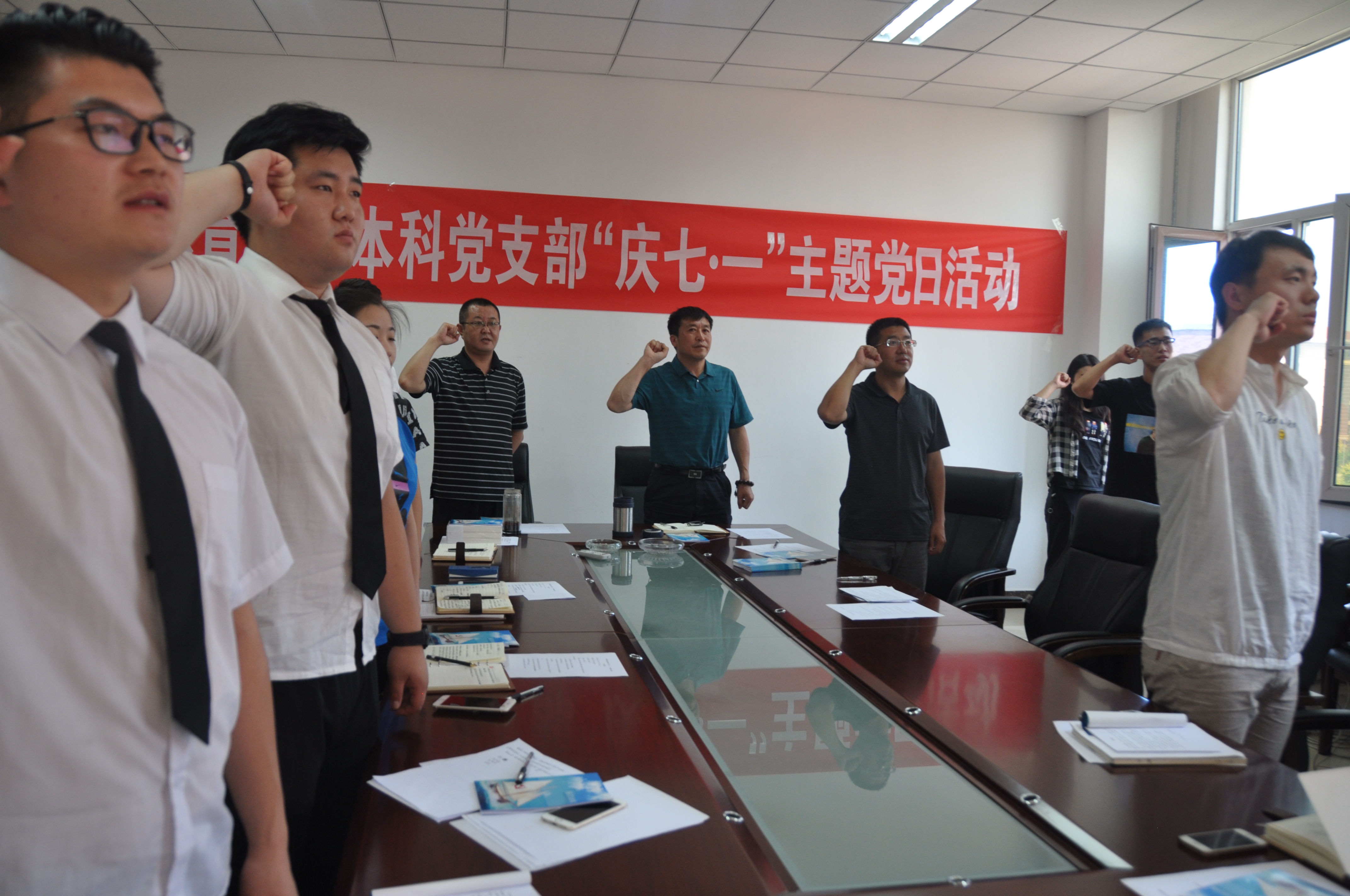 会议最后,全体党员面对鲜艳的党旗重温了入党誓词,全体党员表示将在今后的工作学习中坚定理想信念,不忘初心,继续前进!