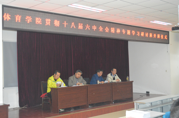 4月20日,我院党委于体育学院五层会议室召开体育学院贯彻十八届六中全会精神专题学习研讨班开班仪式。会议由党委副书记张忠璞老师主持,党委书记任晋军、副院长史冬博、教科办主任宋志伟出席本次会议。