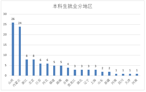 我院本科毕业生就业地区较为广泛,且主要集中在山西、内蒙古、北京、浙江、江苏等一线城市。相较于本科生而言,硕士毕业生就业区域较集中,大多数在山西省内就业。