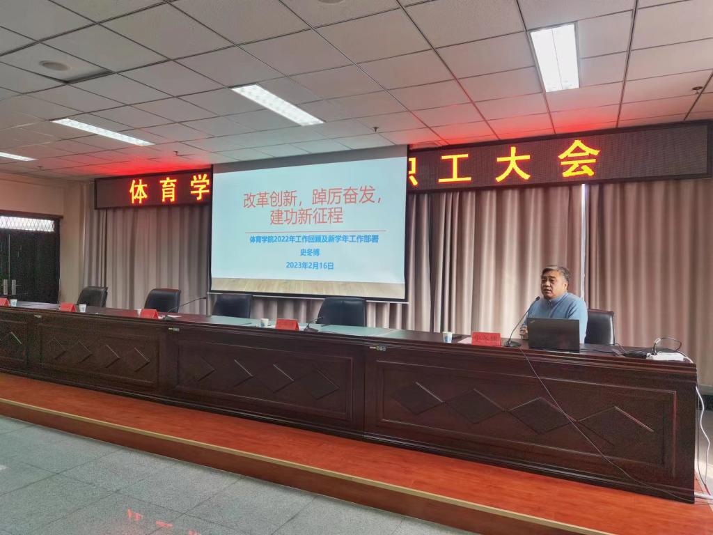 史冬博院长在题为“改革创新 踔厉奋发 建功新征程”的工作报告中,通过对体育学院“大家庭”概念的解读,回顾疫情带来的困难,鼓励大家凝心聚力,为学院发展贡献力量。在对2022年的工作回顾中,总结了学院一年来多方面的优秀成果,对大家的付出给予了肯定。最后从教学、科研、校园活动等多方面布置新一年的重点工作,各位分管副院长责任到人,确保2023年的工作有序落实。