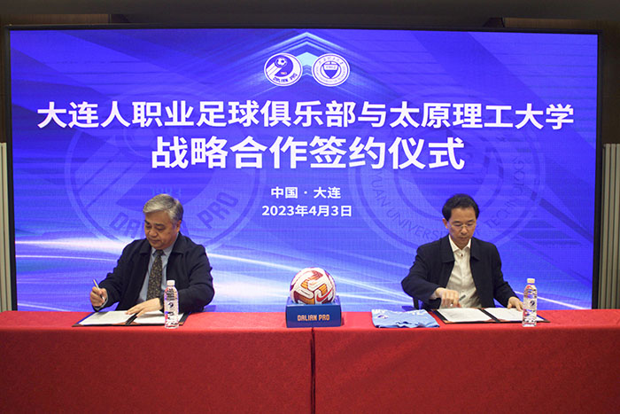 4月3日上午,我校与大连人职业足球俱乐部的战略合作签约仪式在大连足球青训基地隆重举行,院长史冬博、副院长田忠新以及教练员武建文出席。