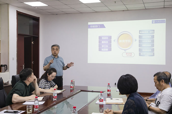 史冬博代表学院就体育学院建设及发展规划作了汇报,详细介绍了学院基本情况、研究生教育、学位教育重点工作存在的主要问题。