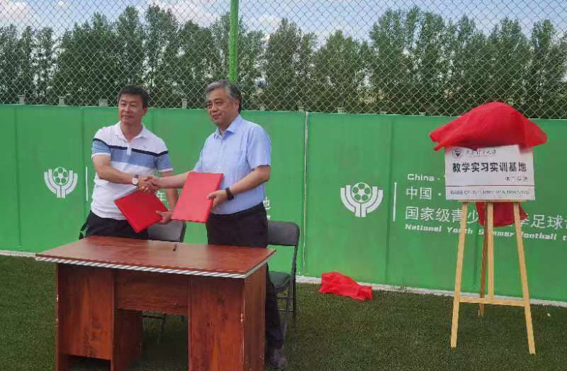 2023年7月9日在右玉县,体育学院院长史冬博教授与右玉国家级青少年足球训练基地董事长王东伟先生共同签订战略合作协议。
