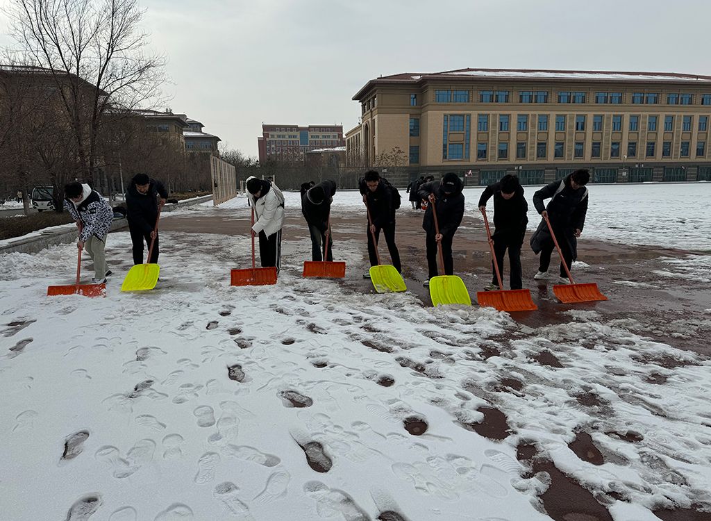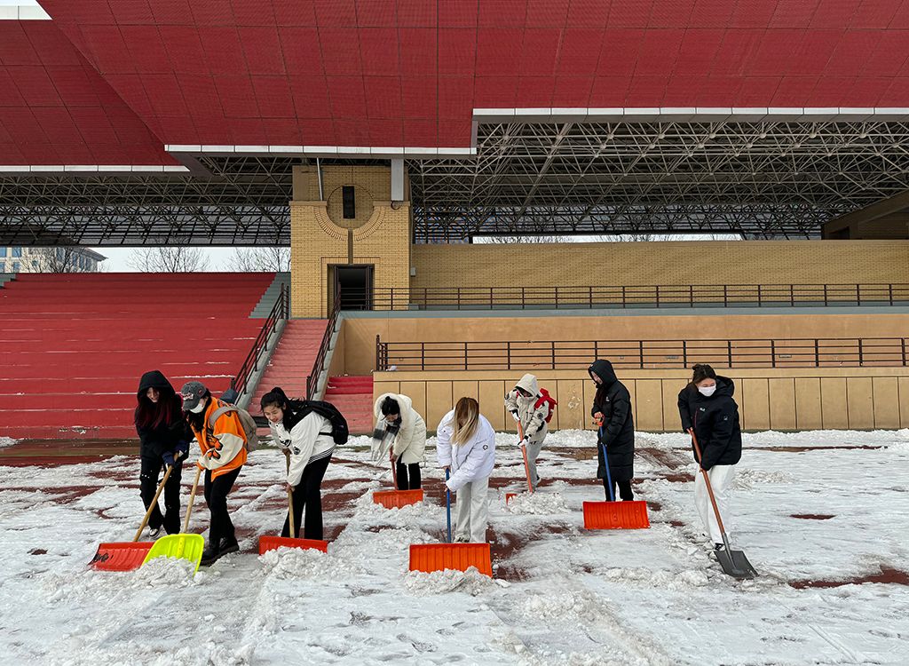 2月26日上午10点,体育学院团委副书记姜昆与青年志愿者们在东操场器材室前集合,带着专业冰雪扫除工具开始劳动。气温骤降、寒风凛冽,却丝毫没有挡住志愿者们的工作热情。大家拿起铁锹,干劲十足,齐心协力清扫操场上课跑道的积雪,皑皑白雪映衬着他们冻红的脸和双手,他们不畏严寒,躬着身子,抡起铁锹,挥舞雪铲,铲雪声打破了雪后的寂静,志愿者们的热情融化了冰雪。