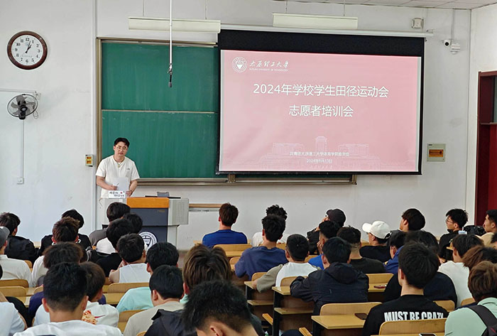 为全面助力2024年太原理工大学学生田径运动会顺利召开,保证裁判工作的落实到位,帮助志愿者更好地熟悉、了解运动会的服务需要、工作内容及注意事项,提高志愿服务水平,为运动员提供高效、全面的服务,体育学院于5月13日在明向校区行知楼B113教室开展2024年学校学生田径运动会志愿者及学生裁判员培训会。体育学院团委副书记姜昆主持大会,体育学院106名志愿者和学生裁判员参加会议。
