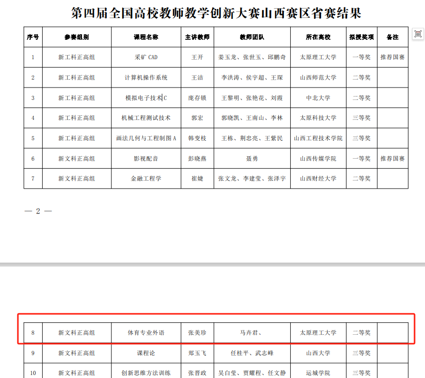 依据《山西省教育厅关于公布第四届全国高校教师教学创新大赛山西赛区获奖名单的通知》我院教授张美珍老师的《体育专业外语》获得新文科正高组全国高校教师教学创新大赛二等奖。