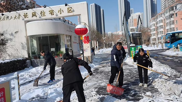 2024年2月20日~21日,山西省气象台对山西中部多地陆续发布寒潮、大风蓝色预警、道路结冰黄色预警和暴雪橙色预警信号。山西省太原市部分地区积雪厚度已达18厘米,给居民的出行和日常生活带来诸多不便。为了积极应对新一轮的寒潮雨雪冰冻天气,充分发挥基层党组织战斗堡垒作用和广大党员先锋模范作用,公体部党支部迅速行动,发出扫雪除冰倡议书,呼吁全体教师党员根据各自住宅小区实际情况,自觉清除门前积雪,第一时间投入到小区公共区域扫雪除冰活动,为道路安全畅通贡献一份力量。同时党支部书记赵平花老师组织住在理工大长风小区的体育学院教师,开展铲雪除冰志愿服务活动,协助小区物业人员进行扫雪除冰工作,确保居民的出行安全。