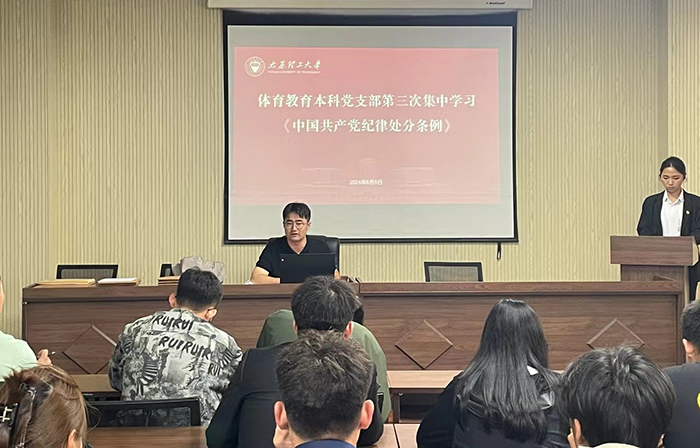 2024年6月5日,体育教育本科党支部于体育学院510会议室召开第三次《中国共产党纪律处分条例》集中学习会议。体育教育本科党支部全体党员参加学习,集中学习由支部书记姜昆主持。