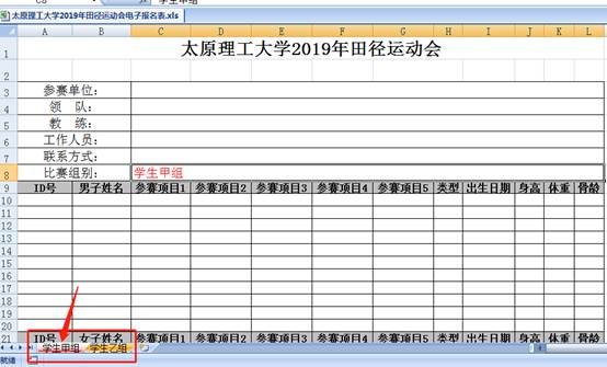2、下载电子报名表后,打开EXCEL表格(必须是office软件,不能使用WPS),根据学院分组点击学生甲组或学生乙组(非体育专业为学生甲组;体育学院、现代科技学院体育专业为学生乙组)。