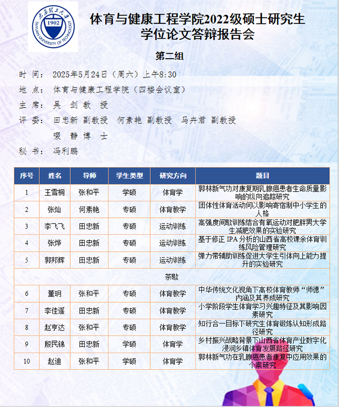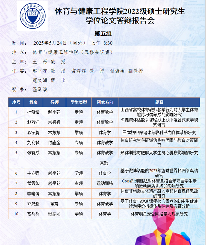 5月22日至25日,体育与健康工程学院进行了2025届硕士研究生论文答辩报告会。根据研究方向,报告会分为5组进行,分别邀请校外专家山西师范大学郑旗教授、山西大学石岩教授、山西师范大学王彤教授、中北大学吴剑教授和山西大学刘映海教授担任答辩委员会主席,体育与健康工程学院硕士研究生导师担任答辩委员会成员。