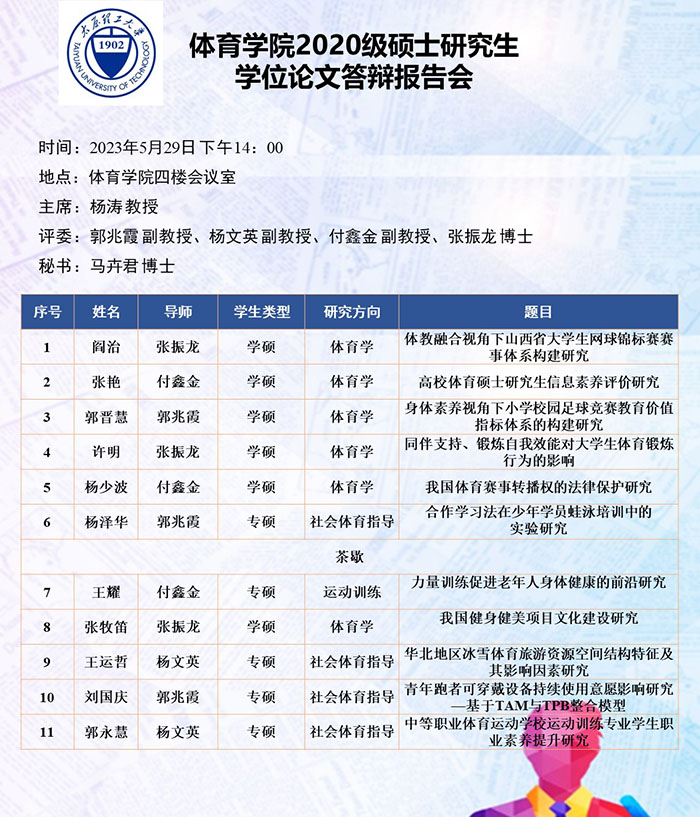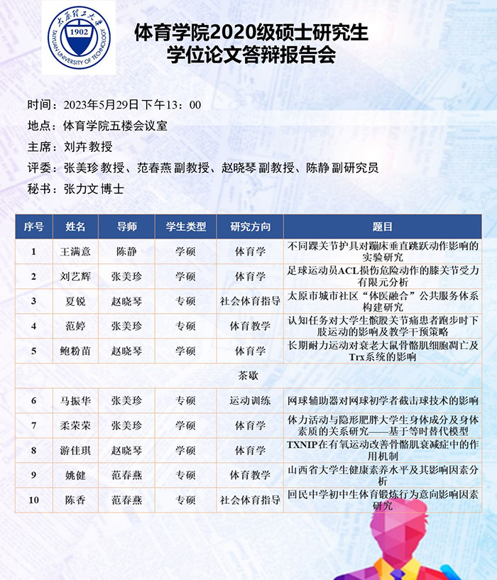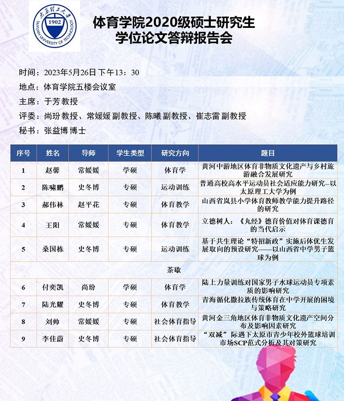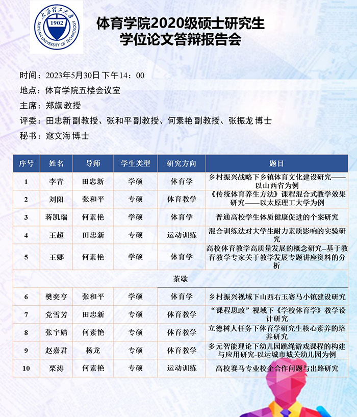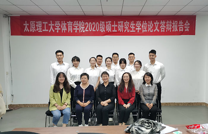 5月26日至30日,体育学院进行了2020级硕士研究生论文答辩报告会。根据研究方向,报告会分为4组进行,均邀请校外专家郑旗(教授,山西师范大学)、刘卉(教授,北京体育大学)、于芳(教授,中北大学)和杨涛(教授,西安体育学院)担任答辩委员会主席,体育学院硕士研究生导师担任答辩委员会成员。
