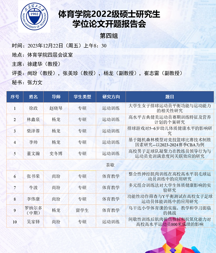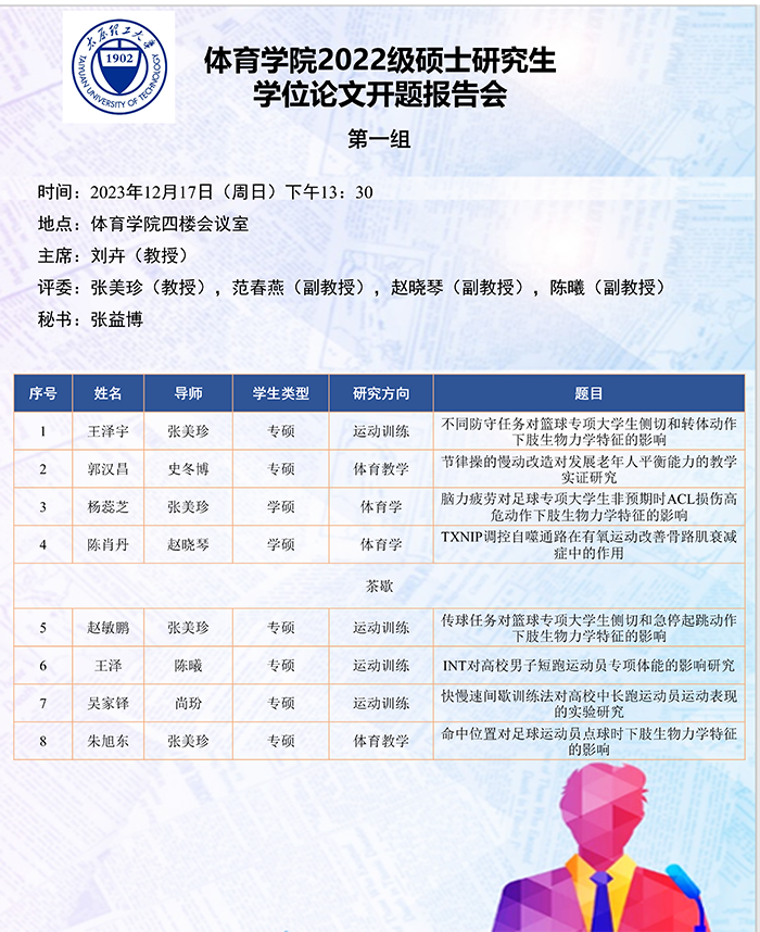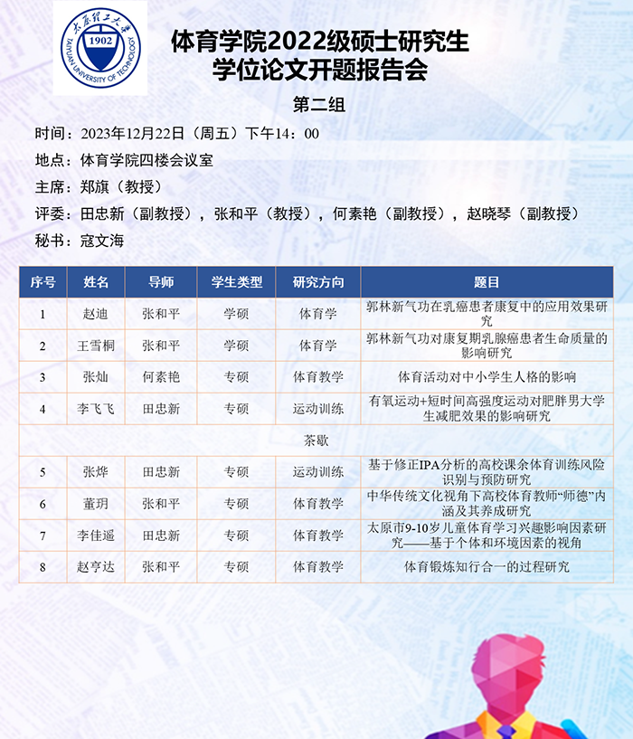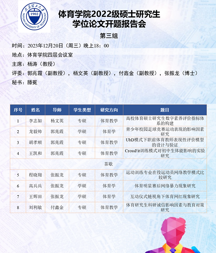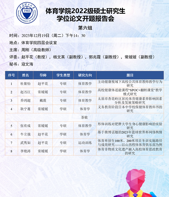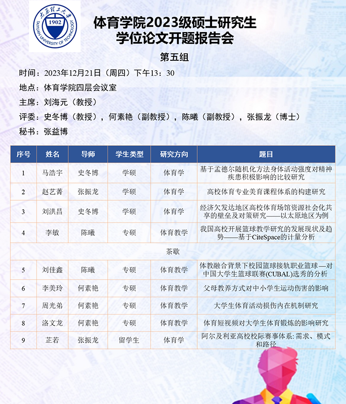 根据研究方向,报告会分为6组进行,分别由史冬博、田忠新、尚玢、张美珍、赵平花、郭兆霞担任组长,由校外专家刘海元(教授,首都体育学院)、郑旗(教授,山西师范大学)、徐建华(教授,福建师范大学)、刘卉(教授,北京体育大学)、周刚(高级教师,太原市教研科研中心)和杨涛(教授,西安体育学院)担任答辩委员会主席,由体育学院硕士生导师担答辩任委员会成员,共同完成了此次开题答辩报告会。