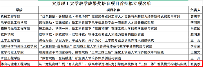 2025年11月13日,太原理工大学公布了2025年度教学成果奖培育项目首批拟立项名单,共有9个项目入选。体育与健康工程学院申报的《从“竞技高峰”到“育人高原”:以高水平运动队引领高校公共体育育人实践》项目成功入选,项目负责人为张美珍教授。