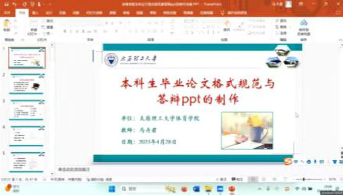 2023年4月28日晚上7点,太原理工大学体育学院和现代科技学院200余名即将毕业的2019级体育教育专业师生齐聚腾讯会议平台,认真聆听由马卉君博士主讲的“本科毕业论文撰写格式规范与答辩PPT制作:从规范到精致的论文写作和答辩演示”。本次讲座是体育教育专业本科生毕业论文提升系列讲座的第五讲,也是最后一讲。