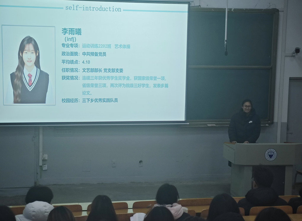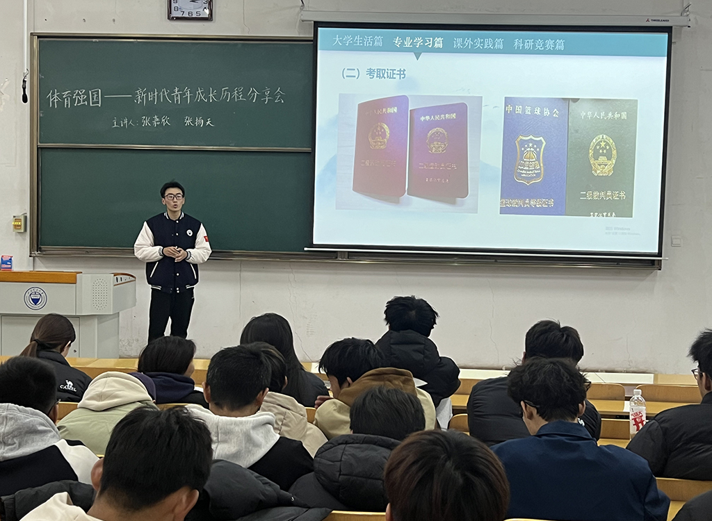 11月27日,在虎峪校区,运动训练专业负责人张振龙为运动训练2024级新生在体育学概念、体育学专业范围、运动训练学培养目标与规格、学制、学分与学位、课程体系等方面进行专业宣讲,包括通识教育课程组成及学分分配、专业教育课程组成及学分分配、实践课程组成及学分分配、在役运动员认定及培养模式、全国运动训练报考、报告情况、学训矛盾表现、应对及域外经验借鉴等。之后,运动训练专业2022级学姐李雨曦从大学生活、专业学习、课外实践、科研竞赛四方面与同学们进行了交流分享。