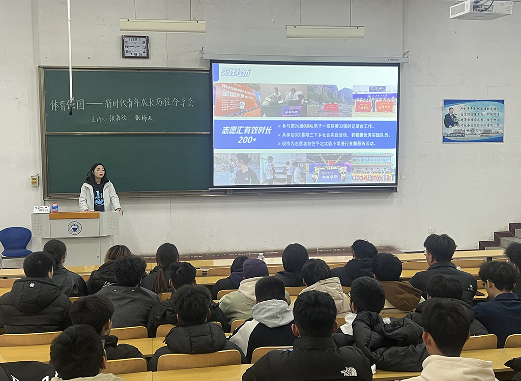 2024年11月26日晚,在明向校区,体育与健康工程学院副院长张和平以《体育教育专业培养计划及专业发展》为主题为体育教育(含赛马方向)新生开展专业介绍,并详细介绍了体育教育系师资队伍、研究方向和历年毕业学生职业发展。12月1日下午,2021级本科生学姐张嘉欣、2022级本科生学长张扬天与同学们进行了体育强国-新时代青年成长历程分享交流,从专业学习、学生工作、课余实践、未来发展四个方面分享了自己在大学期间的学习方法和经验,通过自己精彩的大学生活与同学们共同凝聚奋进力量。