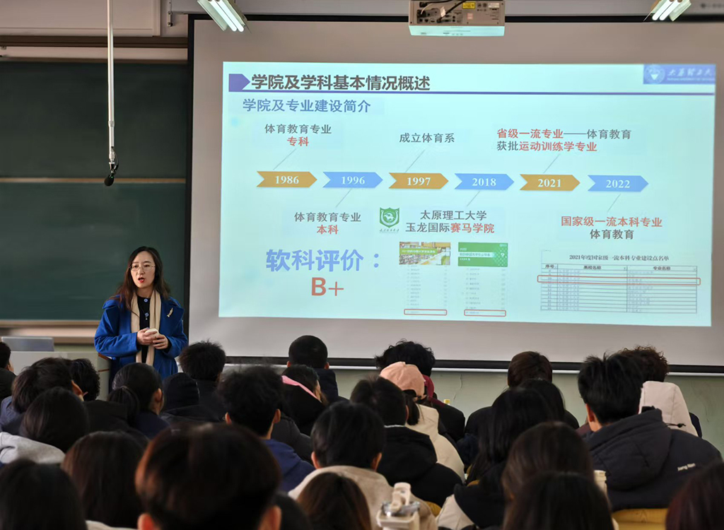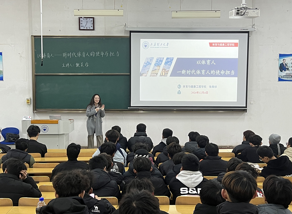 体育与健康工程学院副院长张美珍教授于2024年12月3日、4日分别在虎峪校区致远楼A406教室、明向校区行知楼B119教室为运动训练2024级新生、体育教育(含赛马方向)2024级新生开展《以体育人—新时代体育人的使命与担当》专业教育,介绍学院及专业建设发展的沿革、学科发展现状、师资队伍、人才培养、运动竞赛等情况。