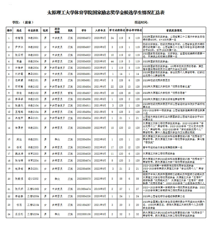 2022-2023学年太原理工大学国家励志奖学金体育学院拟推荐获奖学生公示