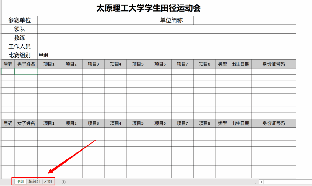 2、下载电子报名表后,打开EXCEL表格(必须是office软件,不能使用WPS),根据学院分组点击甲组、乙组、超级组。