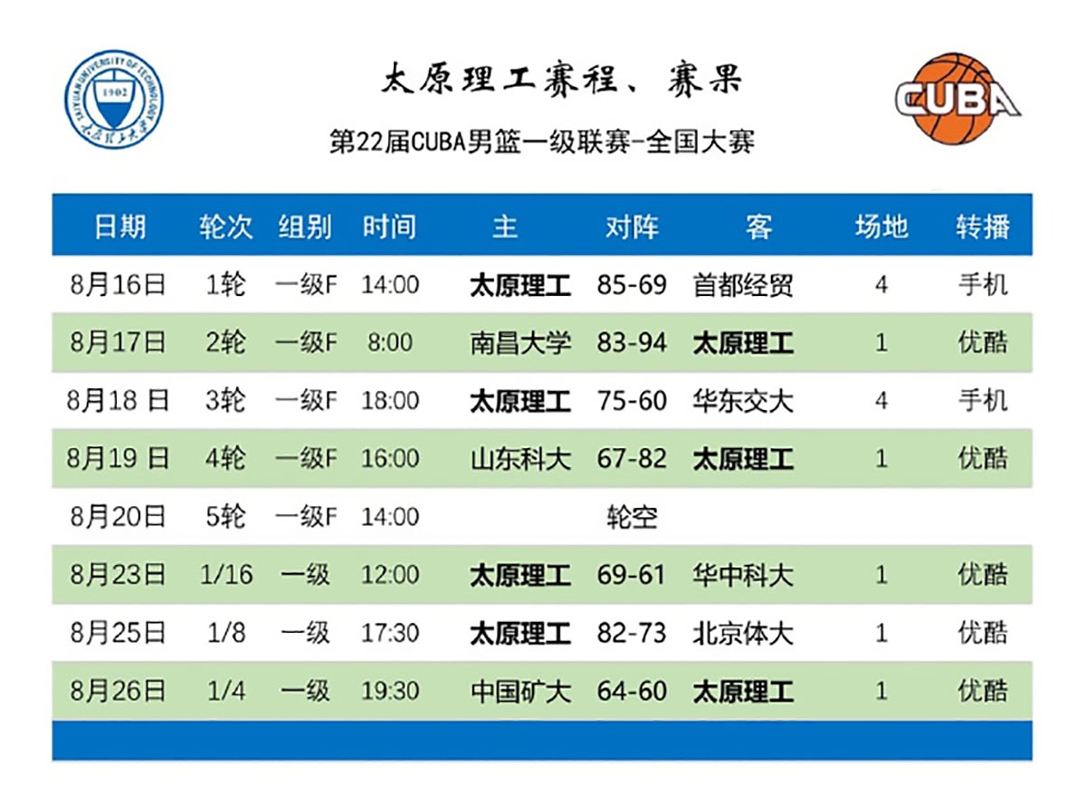 During the elimination series, TYUT defeated Huazhong University of Science and Technology and Beijing Sport University successively and advanced to the top eight and ranked among the CUBA "National Elite Eight Club". In the semi-final on August 26th, the men's basketball team lost to China University of Mining and Technology by a score of 60:64. This is the 20th time in the history of CUBA that TYUT men's basketball team has entered the national quarterfinals.