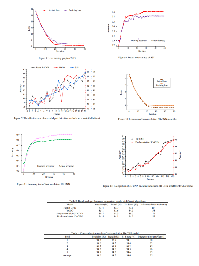 深度学习引领的人工智能浪潮不仅促进了众多行业的发展用于检测系统和运动识别的方法,而且使这些算法的应用更加紧密更贴近日常生活。作为一项深受许多年轻人喜爱的运动人们,篮球已经成为许多年轻人的目标人们学习和训练它的技能动作。研究将SSD与3D-CNN架构相结合,从而提出了一种基于双分辨率3D CNN的算法,旨在识别各种训练技能动作篮球视频。首先,基于SSD的目标检测篮球视频技术动作识别方法并且通过以下方式提取视频帧:这种方法。然后是双分辨率3D-CNN构建,旨在实现对篮球视频技术动作。性能测试对构建的算法模型进行了研究。这个结果发现,SSD具有良好的检测精度训练模型和实际模型中的比率。这个Fast R-CNN、YOLO和SSD的检测精度对同一数据集中的算法进行了比较,结果表明发现另外两个的检测精度算法的检测精度较低SSD算法最高,为93.8%。此外3D-CNN的识别精度和还对双分辨率3D-CNN进行了比较。