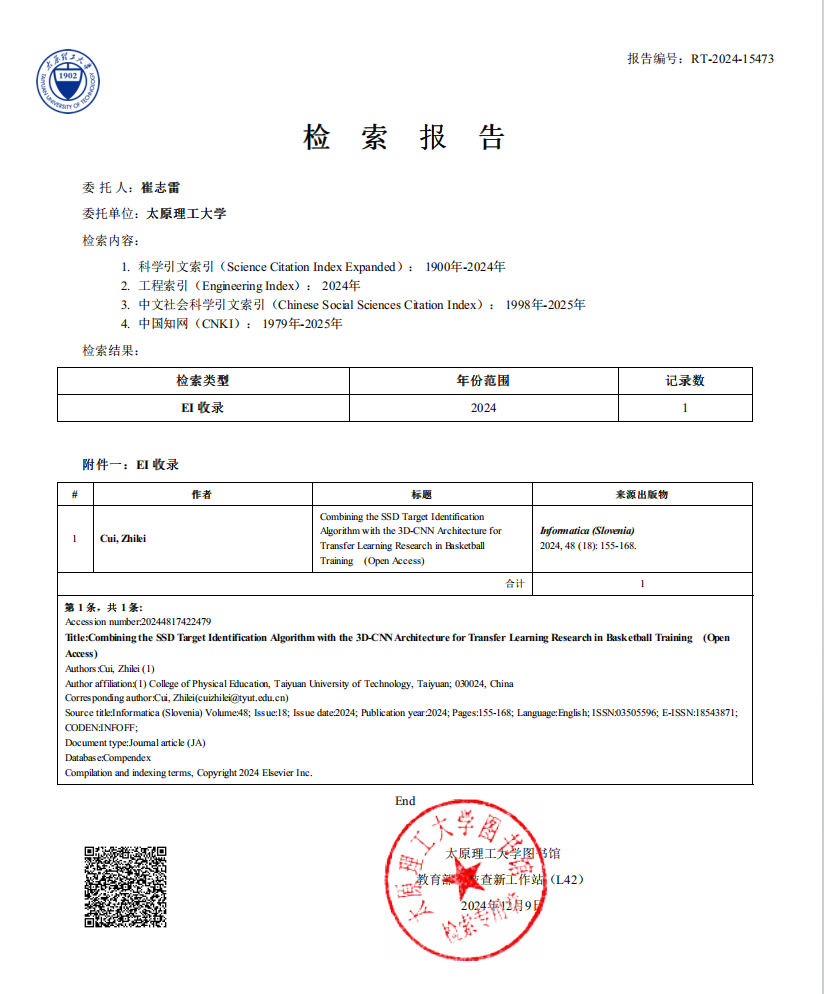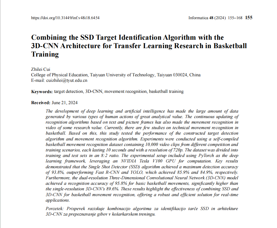 我院教师崔志雷副教授的研究成果《Combining the SSD Target Identification Algorithm with the 3D-CNNArchitecture for Transfer Learning Research in Basketball Training》在《Informatica》在线发表。《Informatica》主要专注于信息系统、计算机科学以及跨学科应用领域。尤其关注这些技术在体育科学中的创新应用,如运动数据分析、运动损伤预测、智能训练系统等。该期刊被工程索引EI(Engineering Index)收录。该论文是我院崔志雷副教授(第一作者、通讯作者)的研究成果,太原理工大学体育学院为署名单位。