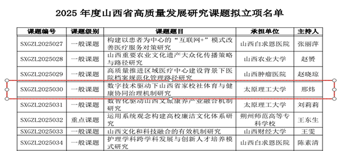 2025年度山西省高质量发展研究课题拟立项名单公示,我院教师邢炜申报的一般课题《数字技术驱动下山西省“家校社”体育与健康协同治理机制研究》获得立项支持。