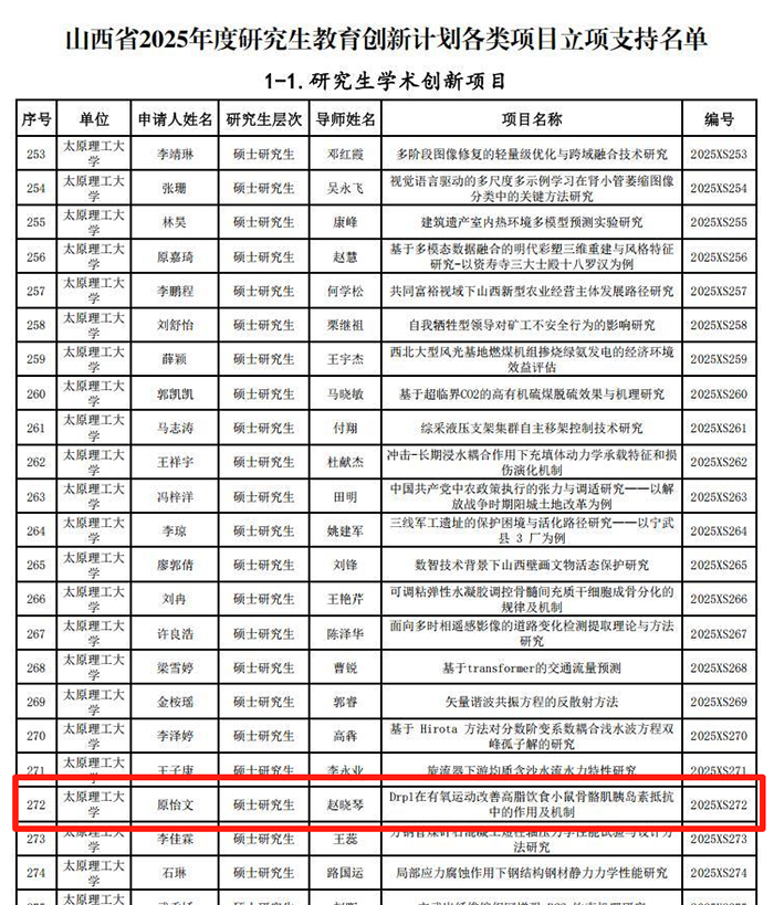 项目名称:Drpl 在有氧运动改善高脂饮食小鼠骨骼肌胰岛素抵抗的作用及机制