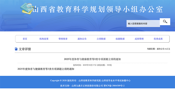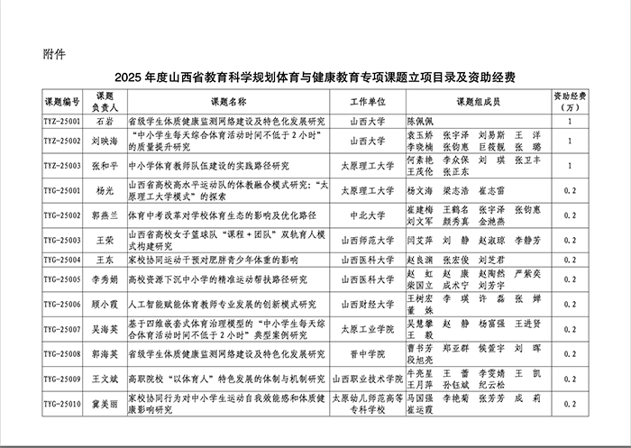 山西省教育科学“十四五”规划2025年度体育与健康教育等3类专项研究课题各专项面向教育强国建设需求和教育高质量发展需要,重点围绕各领域的重要理论和现实问题研究,促进教学实践转化和服务教育改革发展提供决策支撑。我院张和平教授、杨光老师申报的项目获得立项支持。