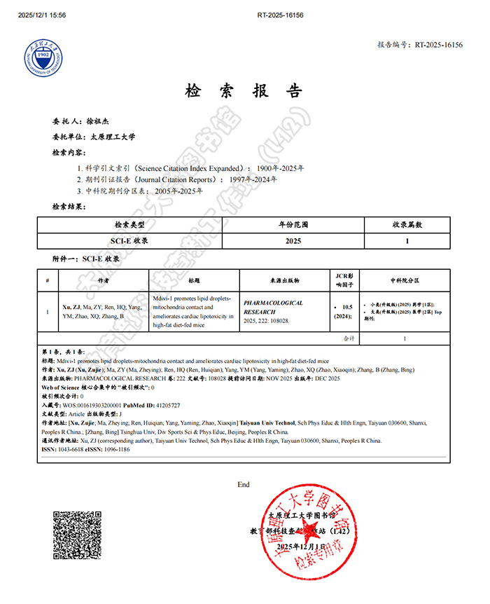 近日,我院徐祖杰副教授团队在国际著名期刊《Pharmacological Research》在线发表了题为《Mdivi-1 promotes lipid droplets-mitochondria contact and ameliorates cardiac lipotoxicity in high-fat diet-fed mice》的重要研究论文。《Pharmacological Research》是一本专注于药理学研究的高影响力期刊,被SCIE(Science Citation Index Expanded)数据库收录,为JCR-Q1、中科院2区Top期刊,影响因子为10.5。徐祖杰副教授与其指导的硕士研究生马哲莹为第一作者,太原理工大学体育与健康工程学院为第一署名单位。
