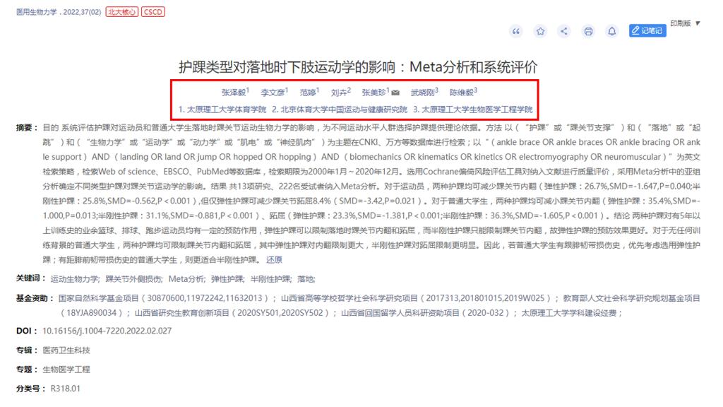 我院教师张美珍教授指导的硕士研究生张泽毅的研究成果《护踝类型对落地时下肢运动学的影响:Meta分析和系统评价》在《医用生物力学》(2022年第2期)发表。《医用生物力学》杂志由上海交通大学主办,中国教育部主管,上海交通大学医学院附属第九人民医院承办,是国内唯一一本公开发行,以积极反映生物力学基础研究与应用研究成果,推动国内外学术交流,促进医、理、工各学科相互了解和合作为目的学术性刊物。目前,该期刊是双核心期刊(北京大学中文核心期刊以及科技部科技核心期刊)。该论文是我院硕士研究生张泽毅在张美珍教授(通讯作者)的指导下,与北京体育大学刘卉教授、太原理工大学陈维毅教授团队的合作成果,太原理工大学体育学院为第一署名单位。