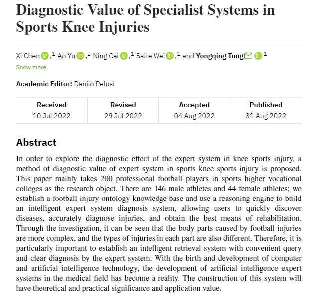 我院教师佟永清副教授、陈曦副教授的研究成果《Diagnostic Value of Specialist Systems in Sports Knee Injuries》在《Scanning》(2022年8月)发表。该刊已被国际权威数据库SCIE、SCI收录,该刊致力于发表经过严格同行评审的高质量原创文章,反映工程技术与跨学科融合领域的新进展、新技术、新成果,促进学科交叉与融合领域科研交流和科研成果转化。该论文是佟永清副教授(通讯作者)、陈曦副教授(第一作者)与韩国又石大学Hyunchoul CHO教授团队合作的成果,太原理工大学体育学院为第一署名单位。