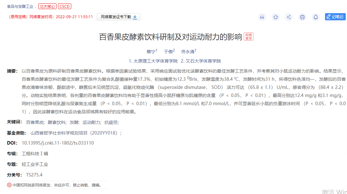 我院教师佟永清副教授、蔡宁老师的研究成果《百香果皮酵素饮料研制及对运动耐力的影响》在《食品与发酵工业》(2022年9月)发表。该刊已被北京大学《中文核心期刊要目总览》来源期刊、CA 化学文摘(美)(2022)、JST 日本科学技术振兴机构数据(日)(2022)、CSCD 中国科学引文数据库来源期刊(2021-2022年度)、WJCI 科技期刊世界影响力指数报(2021)来源期刊收录,该刊致力于发表食品、发酵科学与技术相关领域的原创研究论文,以及具有较高的信息价值、学术导向价值的综述性论文,特别重视食品及其相关交叉学科的最新研究成果的报道。旨在反映食品科学与技术前沿进展及水平,推进学科专业化进程,为国内外的专家、学者、科研人员提供一个良好的传播、分享和交流的平台。该论文是蔡宁老师(第一作者)与佟永清副教授合作研究成果,太原理工大学体育学院为第一署名单位。