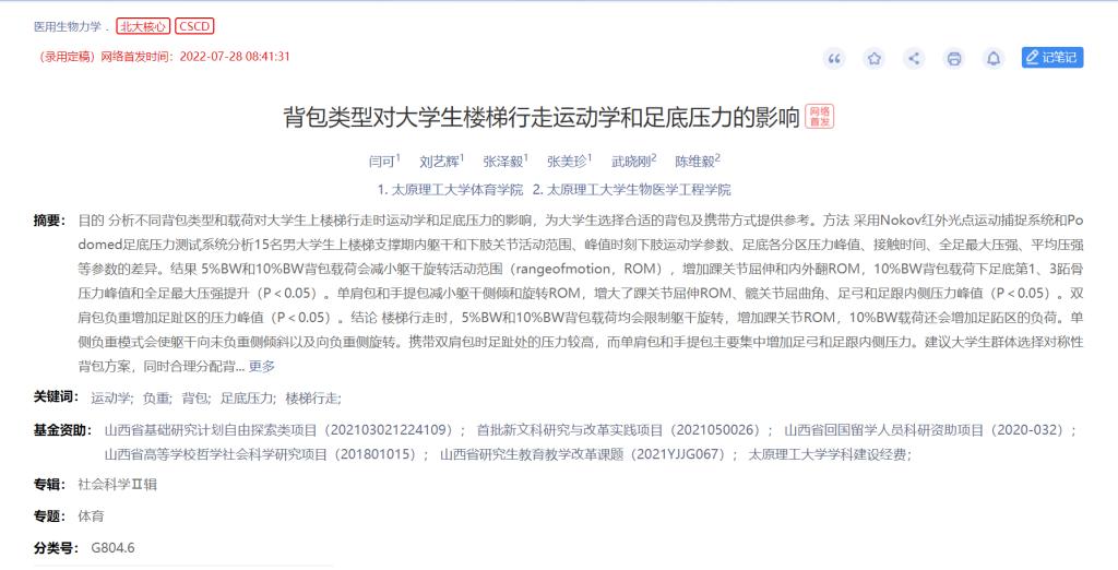 我院张美珍教授指导的硕士研究生闫可的研究成果《背包类型对大学生楼梯行走运动学和足底压力的影响》在《医用生物力学》上网络优先发表。《医用生物力学》杂志由上海交通大学主办,中华人民共和国教育部主管,上海交通大学医学院附属第九人民医院承办,是国内唯一一本公开发行,以积极反映生物力学基础研究与应用研究成果,目前是双核心期刊(北京大学中文核心期刊以及科技部科技核心期刊),并被全球最大的文献摘要与科研信息引用数据库Scopus收录。该论文是我院硕士研究生闫可(第一作者)在导师张美珍教授(通讯作者)的指导下,与太原理工大学陈维毅教授团队的合作成果,太原理工大学体育学院为第一署名单位。