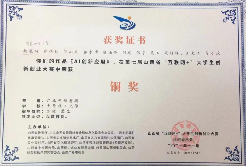 在我院教师陈曦副教授的指导下,我院学子魏塞特(项目负责人)同学的研究项目《AI创新应用》在第七届山西省“互联网+”大学生创新创业大赛中荣获铜奖(2021年11月)。2021年7月25日至27日,由省教育厅等13家单位共同主办,我校承办的“建行杯”第七届山西省“互联网+”大学生创新创业大赛总决赛在我校明向校区举行。本届大赛以“我敢闯、我会创”为主题,旨在全面贯彻落实习近平总书记给中国“互联网+”大学生创新创业大赛“青年红色筑梦之旅”大学生重要回信精神,深入推进大众创业万众创新,推动高等教育高质量发展,加快培养创新创业人才;以赛促教,探索人才培养新途径;以赛促学,培养创新创业生力军;以赛促创,搭建产教融合新平台。该项目是我院学子在体育学院陈曦副教授(第一指导教师)与经济管理学院戴宏副教授(第二指导老师)指导下共同完成的,太原理工大学为第一署名单位。